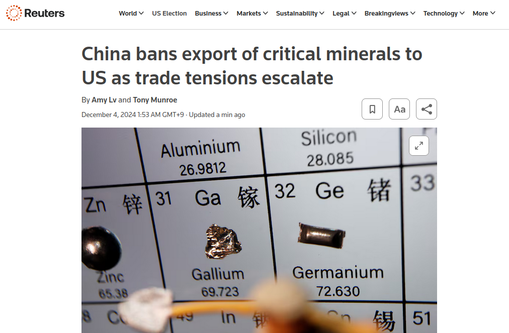 Gallium and germanium are used in semiconductors, while germanium is also used in infrared technology, fibre optic cables and solar cells. Antimony is used in bullets and other weaponry, while graphite is the largest component by volume of electric vehicle batteries. The move has sparked fresh concern that Beijing could next target other critical minerals, including those with even broader usage such as nickel or cobalt. "China has been signalling for some time that it's willing to take these steps, so when is the U.S. going to learn its lesson?" said Todd Malan of Talon Metals (TLO.TO), opens new tab, which is trying to develop a nickel mine in Minnesota and is exploring for the metal in Michigan. The only U.S. nickel mine will be depleted by 2028.