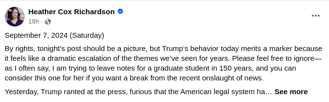 While I'm a huge fan of Richardson's essays, I am not a fan of either of the platforms where she publishes her work: Facebook and Substack. She runs her lucrative subscription business at Substack, a platform that is far too friendly to right-wing extremists, and has as primary financial backers some tech bros who exemplify the worst of Silicon Valley. I would pay gladly for a subscription if this great work appeared on almost any other payment-enabled site (such as Ghost, where I publish this newsletter), but alas that doesn't seem to be in the cards.
