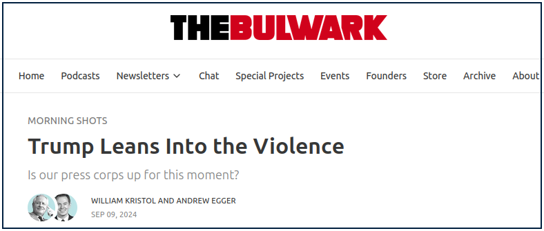 A near majority of voters say Mr. Trump is “not too far” to the left or right on the issues, while only around one-third say he’s “too far to the right.” Nearly half of voters, in contrast, say Ms. Harris is too far to the left; only 41 percent say she’s “not too far either way.” Nate Cohn in the New York Times, citing a recent poll. [Editor's note: This absurd misperception among the electorate can be largely attributed to the failures at media outlets like the New York Times to do their jobs.]